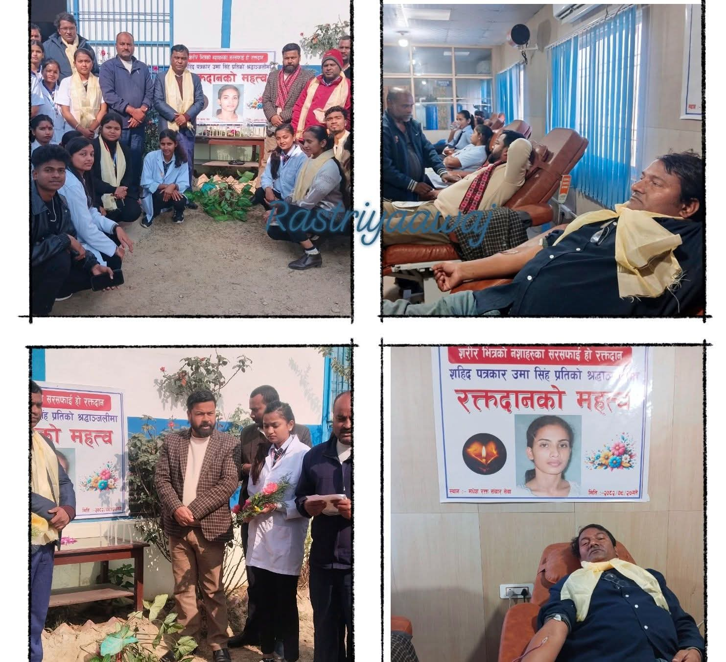 राष्ट्रिय आवाज  जनकपुरधाम, पुस २७ गते  “शरीर भित्रका नशाहरूको सरसफाइ हो रक्तदान” भन्ने सन्देशसहित शहिद पत्रकार उमा सिंह प्रति श्रद्धाञ्जली अर्पण गर्दै रक्तदान कार्यक्रम सम्पन्..