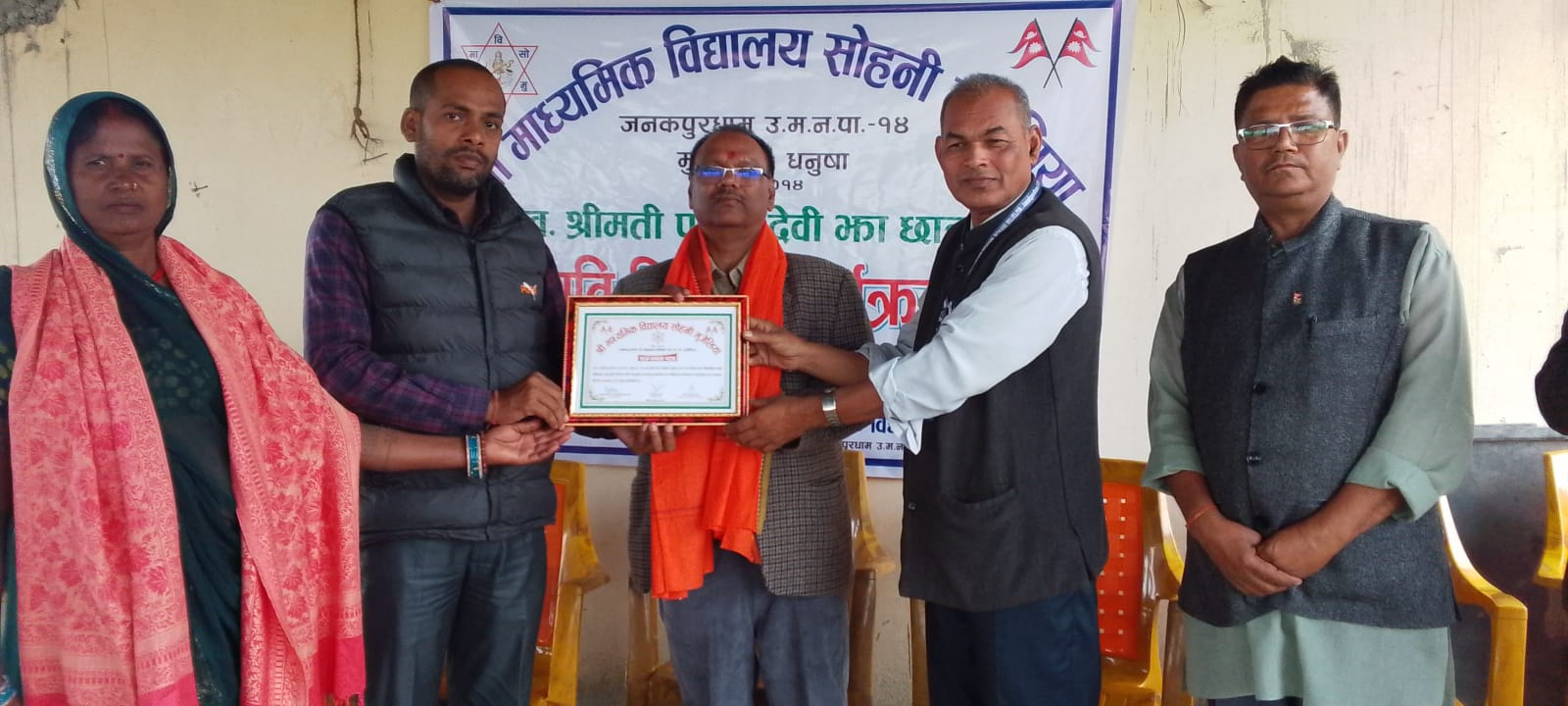 भागचरण यादव जनकपुर धाम,मंसिर ८ गते सोमबार जनकपुरधाम उप–महानगरपालिका वडा नं. १४ स्थित श्री माध्यमिक विद्यालय सोहनी मुजेलियामा स्वर्गीय पुण्य देवी झाको स्मृतिमा स्थापना गरिएको छात्..